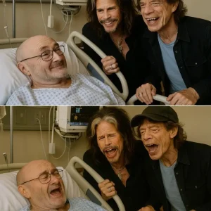 They came like a storm breaking the stillness — Mick Jagger, the eternal Rolling Stones frontman, and Steven Tyler, Aerosmith’s wild‑eyed rock icon, striding through the hospital’s sterile corridors to see their ailing friend Phil Collins, whose declining health has sparked deep concern among those who know him best, and witnesses described how the room seemed to light up when Mick, with his trademark swagger muted by worry, leaned over to clasp Phil’s hand, while Steven, draped in his signature scarves and beads, perched at the bedside, cracking jokes and softly singing in that unmistakable raspy voice, turning the bleak atmosphere into something that felt like an intimate jam session between brothers, and insiders revealed that the three men spoke for hours, reminiscing about reckless tours, unforgettable studio nights, and the kind of memories only legends could share, with bursts of laughter dissolving into long silences heavy with emotion, one nurse whispering, “It felt like rock history itself was in that room,” and though no cameras were allowed, news of the visit spread like wildfire, fans flooding social media with prayers for Phil and awe at this rare, bittersweet meeting of giants. Details in comments 👇👇👇